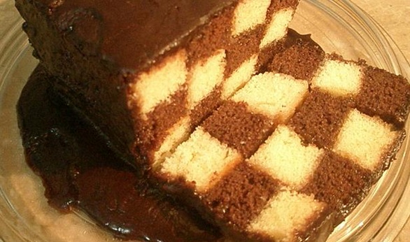- تُرص الحلقات بالتناوب (مع دهن الطرف الخارجي لكل حلقة بالمربى حتى تلتصق الحلقات)، بحيث تُوضع الحلقة الكبيرة بالكيك الأبيض تليها الحلقة الأصغر من كيك الشكولاتة وهكذا حتى تكتمل أول طبقة.