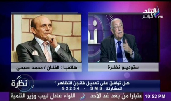 قال الفنان محمد صبحي إن الشخص الذي يطالب بحقوقه دون المساس بمؤسسات الدولة أو الاعتداء على حرية الآخرين لا يجب أن يتخوف من الحصول على تصريح للتظاهر، مشيرا إلى أنه يتوجب على الجمعيات التي تنادي بحقوق الإنسان أن ترفض قانون التظاهر الجديد الذي يجري إعداده لضعفه الشديد، كما أنه لابد من تغليظ العقوبات على من يتظاهر دون تصريح من الجهات المعنية.
