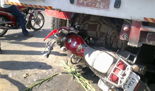 وبالانتقال والفحص تبين حدوث تصادم بين السيارة رقم و ر أ 3682/ 4359 نقل بمقطورة قيادة محمد سيد جمعه محمد 30 سنة سائق ومقيم بني سويف والدراجة البخارية رقم ب ع د 3417 قيادة طارق مصطفى عبدالحليم 12 سنة طالب ومقيم قرية كوم أمبو / دائرة المركزأثناء سير السيارة الأولى بالطريق المشار إليه، اختلت عجلة القيادة بيد قائدها واصطدمت بالدراجة البخارية التي تصادف قدومها في الاتجاه المقابل.