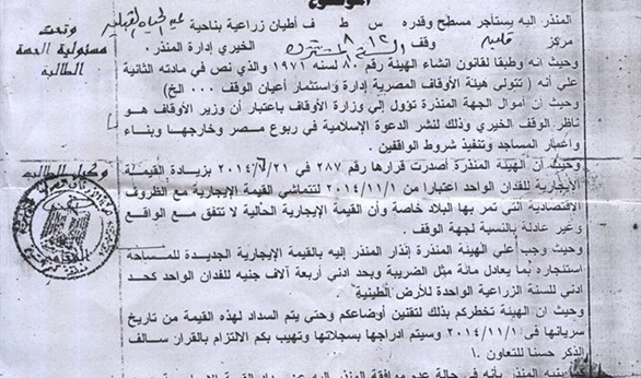 وأضاف شعلان: "وقامت هيئة الأوقاف بعد ذلك بإرسال إنذارات من المحكمة إلينا للدفع أو سحب الأرض منا وبيعها في المزاد العلني"، متسائلاً: "فكيف في عهد الرئيس السيسي الذي نادى بتحسين أوضاع الفلاح أن نعامل بهذا الظلم والإجحاف، فقد انتخبنا الرئيس السيسي لأننا وجدنا فيه روح عبد الناصر في الإصلاح وحب الوطن، إلا أن هيئة الأوقاف تعاملنا معاملة الإقطاع الذي أسقطه جمال عبد الناصر، ونطلب من رئيس الجمهورية إسقاط إقطاع هيئة الأوقاف علينا".