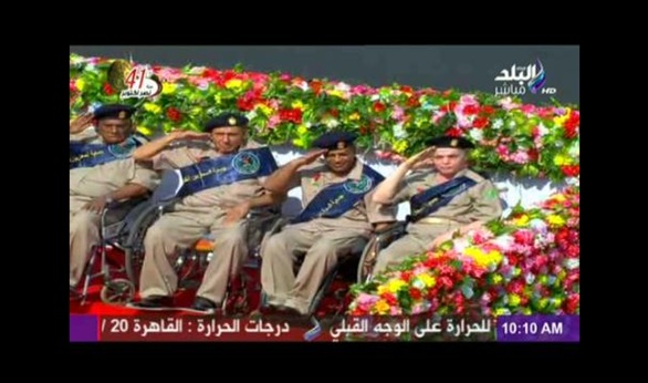 شهد حفل انتصار أكتوبر الـ41 بالكلية الحربية فقرة خاصة لمصابي ومحاربي حرب أكتوبر، حيث دخلوا على متن سيارة مزينة بالورود، موجهين التحية للرئيس عبد الفتاح السيسي، الذي بادلهم التحية.