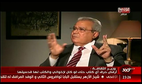 قال الدكتور جابر عصفور ،وزير الثقافة ، إنه ضد حرق أي كتاب سواء كان لجماعة الإخوان المسلمين أو كان ضد الإسلام او يهاجم تعاليمه ولابد من مواجهة الفكر بالفكر موضحا انه ينبغي منع كافة الكتب التي تتحدث عن الثعبان الأقعر ، وعذاب القبر " .