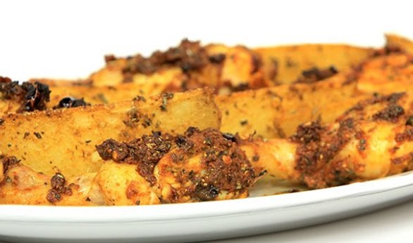 - ضعى البطاطي المقطعة على أربع فى التتبيلة ورصيها فى صينية