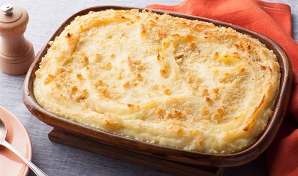 6-صبى خليط البطاطس فى صينية ويفرد بها ويسوى وجها بظهر الملعقة ثم رشى جبن الشيدر والبقسماط على الوجه