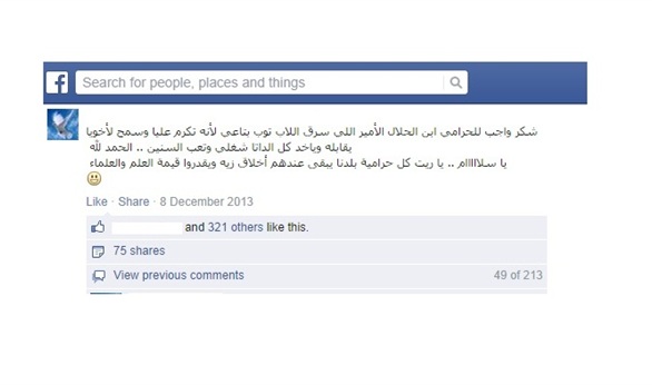 ونشرت المستخدمة على حائطها الخاص بوست يقول "شكر واجب للحرامي ابن الحلال الأمير اللي سرق اللابتوب بتاعي لأنه تكرم عليا وسمح لأخويا يقابله وياخد كل الداتا شغلي وتعب السنين.. الحمد لله" وأضافت "يا سلااااام.. يا ريت كل حرامية بلدنا يبقى عندهم أخلاق زيه ويقدروا قيمة العلم والعلماء".