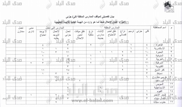 وأوضح البيان أن تلك المدارس المغلقة التي تحتاج الى ترميم كلي عددهها 136 مدرسة على مستوى الجمهورية، وهي مقسمة كالتالي: 4 مدارس في القاهرة، ومدرسة في الاسكندرية، و10 مدارس في البحيرة، ومدرستان في المنوفية، و5 مدارس في الغربية، و21 مدرسة في الشرقية، ومدرسة في القليوبية، و7 مدارس في كفر الشيخ، و3 مدارس في دمياط، و6 مدارس في مرسى مطروح، ومدرسة في الفيوم، ومدرستان في البحر الاحمر، و3 مدارس في شمال سيناء، ومدرسة في الجيزة، ومدرستان في بني سويف، و6 مدارس في المنيا، و7 مدارس في أسيوط، و14 مدرسة في سوهاج، و3 مدارس في قنا، و5 مدارس في الاقصر، و16 مدرسة في اسوان، و5 مدارس في الوادي الجديد، و11 مدرسة في الدقهلية.