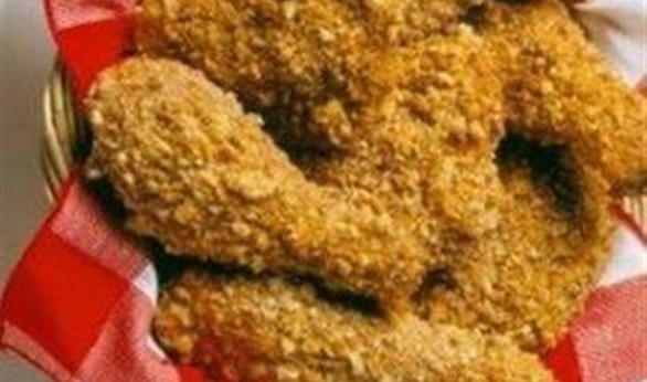 -ترفع قطع الدجاج من الزيت وتوضع فوق ورق أو شبكة معدنية للتخلص من الزيت الزائد.