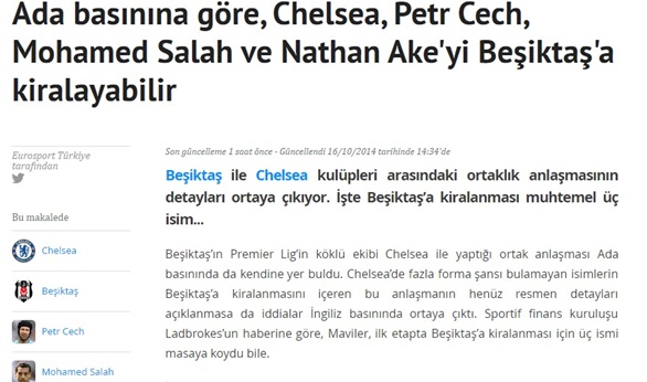 وأضاف أن نادي بيشكتاش طلب من تشيلسي ضم ثلاثة لاعبين على سبيل الاعارة بسبب عدم مشاركتهم مع تشيلسي بصفة أساسية وهم حارس المرمى التشيكي بيتر تشيك وصانع الالعاب المصري محمد صلاح والمدافع الهولندي ناثان أكي.