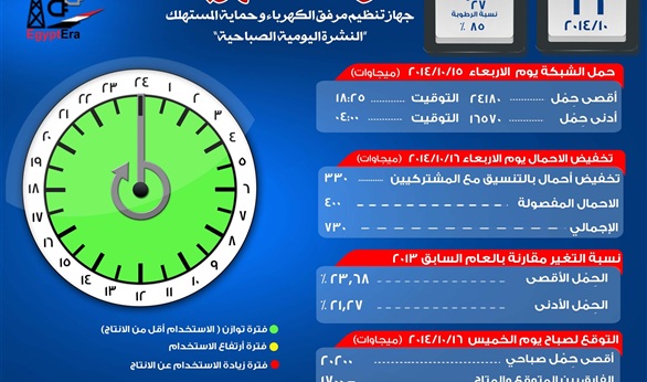 ونوه المركز القومي للتحكم في الطاقة بأن مؤشر حالة الحمل ظهر باللون الأخضر منذ منتصف الليل وبداية اليوم حتى العاشرة و20 دقيقة صباحا.