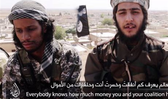 ودعا عنصر إرهابي بلغة انجليزية تحمل لكنة بريطانية القيادات العسكرية الدولية لإرسال قواتهم على الأرض حتى يتسنى لهم هزيمتها وقطع رءوسهم ، في إشارة واضحة لذبح الرهائن الغربيين خلال الأشهر الماضية.