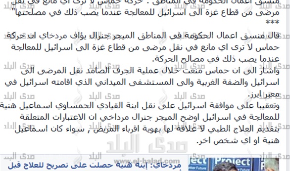 يذكر أن مصادر أفادت لوكالات الأنباء، بأن ابنة إسماعيل هنية القيادي في حركة حماس في غزة أدخلت إلى مستشفى في إسرائيل للعلاج الطارئ هذا الشهر؛ بعدما تعرضت لمضاعفات عقب إجراء طبي روتيني.