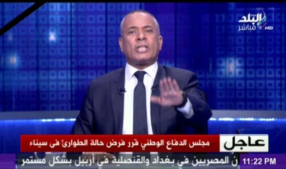 قال الإعلامي أحمد موسي، إن مجلس الدفاع الوطني قرر فرض حالة الطوارئ في سيناء لمدة 3 شهور، مشيراً إلى أن "هذا الأمر غير كاف لدحر الإرهاب هناك، وننتظر المزيد من القررات التي تشفي غليل أبناء الوطن مطالبا بقرارات أشد قسوة وعنفا للقضاء على الخونة والإرهابيين".