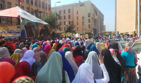 ورفع الطلاب إشارات رابعة العدوية وصور الطلاب المقبوض عليهم ولافتات تطالب بالإفراج عنهم، مرددين هتافات مناهضة للسلطة.