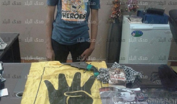 وعلى الفور انتقل رجال الأمن وبإعداد الأكمنة اللازمة تم ضبطه وبحوزته سلاح ناري وصورة لرئيس الجمهورية مدون عليها عبارات مسيئة للجيش والشرطة، وعلم شعار رابعة، وشال، وهاتف محمول واعترف بانتمائه للاخوان وتولت النيابة العامة التحقيق.