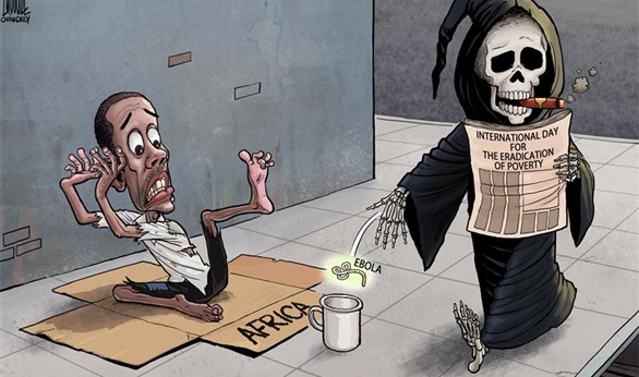 ويبدو الرئيس الأمريكي باراك أوباما في صورة فقير هندي يداعب إحدى حيات الكوبرا الوهمية، بينما يعبر رمز الموت بالقرب منه، حيث يتطوع بإلقاء فيروس الايبولا في العلبة المخصصة لجمع التبرعات.