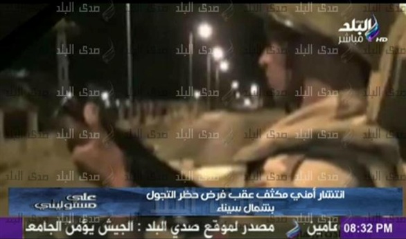 عرض الإعلامي أحمد موسي، لحظات حية لتطبيق حظر التجوال في بعض المناطق بشمال سيناء مثل الشيخ زوايد وغيرها، والتي خلت من المارة تماماً مع تكثيف لدوريات الجيش التي تجوب الشوارع مصحوبة بالمدرعات العسكرية.