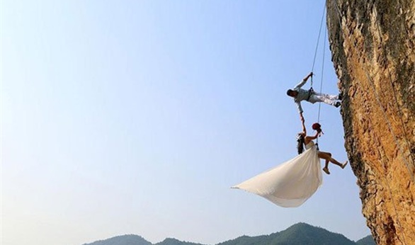 قام عروسان بإلتقاط أخطر وأجرأ صور زفاف فى العالم على الإطلاق حيث إستغلا حبهما وهوايتهما لتسلق الجبال وقاما بإلتقاط صور زفافهما وهم يتسلقان إحدى المرتفعات فى غاية الخطورة بمدينة صينية بملابس الزفاف والفستان الأبيض .