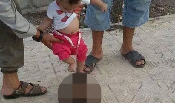 نشرت صحيفة "ديلي ميل" البريطانية صورة صادمة لأحد عناصر تنظيم "داعش" الإرهابي وهو يشجع طفله الرضيع على ركل رأس جندي سوري مقطوعة وهو يضحك هو ورفاقه.