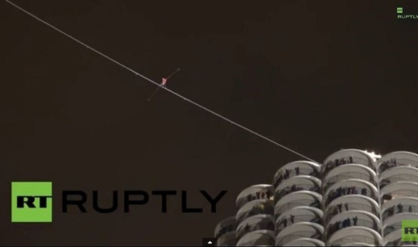 تمكن الآلاف من مشاهدة مشدوهين سير البهلوان "واليندا" على حبال مشدودة بين ناطحات السحاب بدون أية شبكة أو حزام أمان في شيكاغو مساء الأحد 2 نوفمبر.
