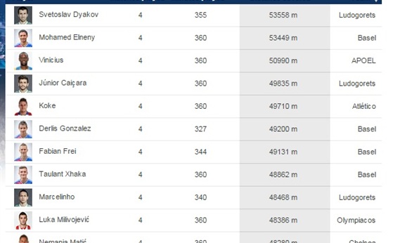 وجائت الاحصائية لتؤكد أن ستيفوسلاف دياكوف لاعب لودجوريتس رازجراد البلغاري يحتل المركز الأول في الجري داخل الملعب حيث قطع مسافة 53 كيلو و558 مترا خلال 4 مباريات.