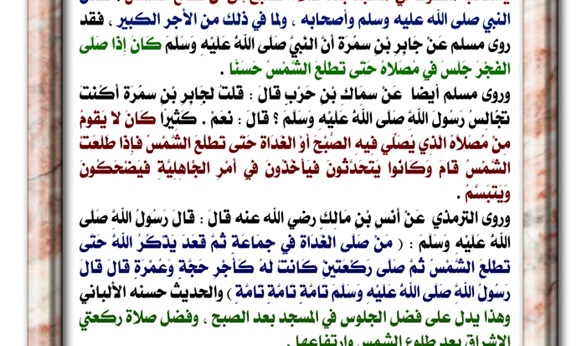 كان من عادة رسول الله صلى الله عليه وسلم أن يبقى في المسجد بعد صلاة الفجر يذكر الله عز وجل حتى طلوع الشمس؛ فقد روى مسلم عن جابر بن سَمُرَةَ رضي الله عنه: «أَنَّ النَّبِيَّ صلى الله عليه وسلم كَانَ إِذَا صَلَّى الْفَجْرَ جَلَسَ فِي مُصَلَّاهُ حَتَّى تَطْلُعَ الشَّمْسُ حَسَنًا».