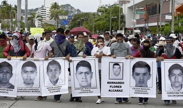 وكان آلاف المكسيكيين قد احتشدوا في شوارع العاصمة مكسيو سيتي قبل أيام للاحتجاج على بطء سير التحقيقات الخاصة بقضية اختفاء 43 طالبا - تتراوح أعمارهم بين 17 و21 عاما - عقب اندلاع اشتباكات بينهم وبين قوات الشرطة في ولاية "جيريرو" الواقعة جنوب غرب البلاد في سبتمبر الماضي.