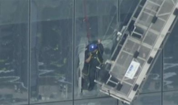 بالفيديو.. إنقاذ عاملي تنظيف زجاج علقا على ارتفاع 69 طابقا