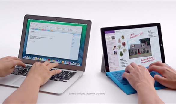 وضعت مايكروسوفت الكمبيوتر الهجين الخاص بها Surface Pro 3 في مقارنة دعائية مع كمبيوتر أبل Macbook Air للتأكيد على أن جهازها أفضل، على حد وصفها.