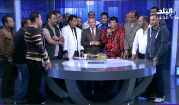 ورقص "شعبولا" مستخدما سكينا علي الهواء، ليشاركه الرقص بحماس الإعلامي أحمد موسي وفريق عمل برنامج "علي مسئوليتي" احتفالا بعيد ميلاد الرئيس عبدالفتاح السيسي .