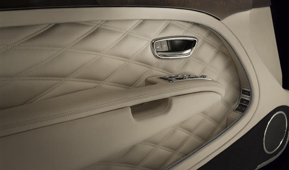 وقد استخدم الأزرق البراق في إبراز المهارة الحرفية الفائقة للمتخصصين في اللمسات الجمالية لدى بنتلي، حيث استخدمت خيوط من اللون الأزرق البراق في التخييط يدوياً على الجلود ذات ألوان الكتان. ويقابل الكسوة ذات اللون الخفيف جلود بيلوجا الناعمة الفاخرة حول النهايات العلوية للأبواب ممتداً إلى الجزء الخلفي من السيارة ويحيطه إطار من الكروم المصقول.