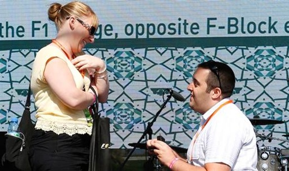 واجتمع المئات من مشجعي رياضة فورميلا-1 أمام المنصة، حين تقدم البريطاني "لورانت" القادم من مدينة برمنجهام في المملكة المتحدة بطلب يد "دانييل كوك"، 33 عاماً، ولحسن حظ البريطاني وافقت دانييل واحتفل معهم الجمهور بهذه المناسبة السعيدة.