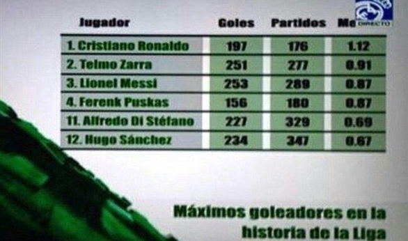 أكدت قناة ريال مدريد الرسمية بأن كريستيانو رونالدو نجم الفريق الملكى هو الهداف التاريخي لـ "الليجا" الاسبانية وليس ليونيل ميسي نجم برشلونة.