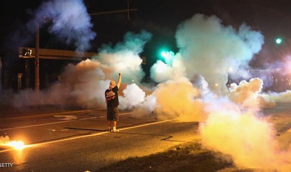 وتجمع المحتجون خارج مركز شرطة فيرجسون أمس لليلة الثانية على التوالي في أعقاب قرار هيئة محلفين بعدم ملاحقة رجل الشرطة دارن ويلسون في حادثة إطلاق النار التي أدت الى مقتل الفتى الأسود مايكل براون