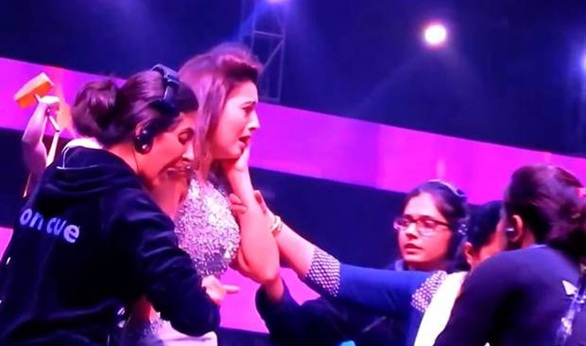 أصيبت مذيعة هندية تدعى غاوار خان بصدمة بعد كبيرة عند تقديمها إحدى البرامج الغنائية على الهواء بعد قيام أحد الحاضرين بصفعها على وجهها بقوة بسبب ملابسها المثيرة .