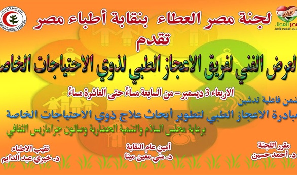 تنظم لجنة مصر العطاء بنقابة أطباء مصر بالتعاون مع مؤسسة مجلس السلام والتنمية الحضارية وصالون جرامازيس الثقافي العرض الفني لفريق الاعجاز الطبي لذوي الاحتاجات الخاصة بمناسبة اليوم العالمي للمعاق اليوم الأربعاء بدار الحكمة في السابعة مساءً