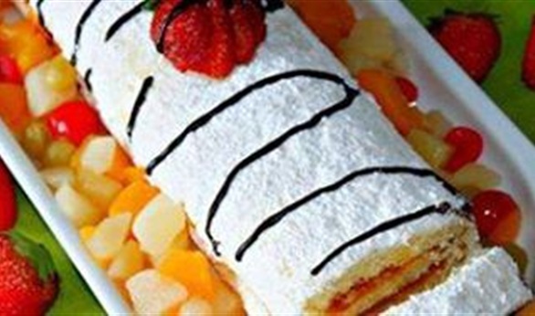 - ندهن السويسرول بالمربى و نلفه بواسطة ورق الزبدة بشكل اسطواني و نضعه في الثلاجة حتى يبرد .