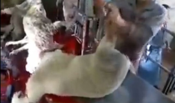 يظهر الفيديو الخرفان تمر على سير كهربائي ويقف الجزار أمام السير، ليصعق الخروف بآلة بيده في رأسه ثم يعطيه لشخص آخر يقوم بتعليقه لسلخه وبيع لحومه بالأسواق.