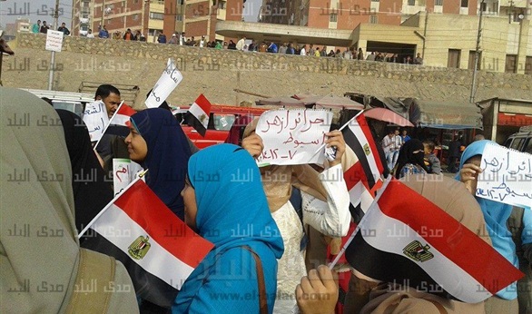 ورفعت المشاركات فى الوقفة لافتات مكتوب عليها "حرائر أزهر أسيوط" مرددين هتافات مناهضة للجيش والشرطة؛ رافعين شارات رابعة وصور للرئيس المعزول محمد مرسي.