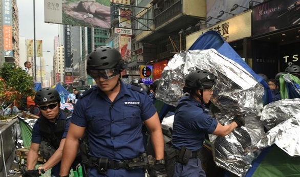 واتخذ مئات من الشرطة وضع الاستعداد في حي ادميرالتي الذي يوجد به مباني الحكومة والمجاور لحي الاعمال بالمركز المالي الاسيوي بينما استخدم عمال يرتدون خوذات أجهزة لقطع الاسلاك لازالة متاريس اقامها المحتجون بعد ان صدر أمر قضائي باخلاء الموقع قبل يومين.
