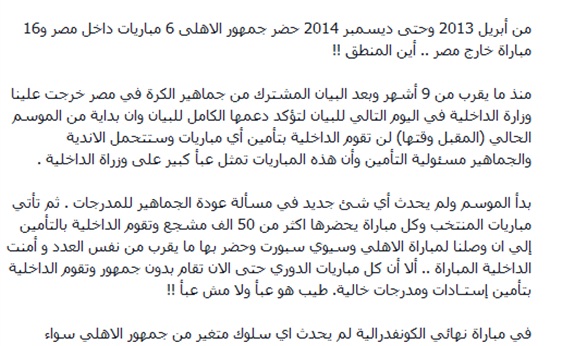 وأضافت في بيان عنونته بـ "من أبريل 2013 وحتى ديسمبر 2014 حضر جمهور الاهلى 6 مباريات داخل مصر و16 مباراة خارج مصر .. أين المنطق ":" منذ ما يقرب من 9 أشهر وبعد البيان المشترك من جماهير الكرة في مصر خرجت علينا وزارة الداخلية في اليوم التالي للبيان لتؤكد دعمها الكامل للبيان وان بداية من الموسم الحالي (المقبل وقتها) لن تقوم الداخلية بتأمين أي مباريات وستتحمل الاندية والجماهير مسئولية التأمين وأن هذه المباريات تمثل عبئا كبيرا على وزارة الداخلية".