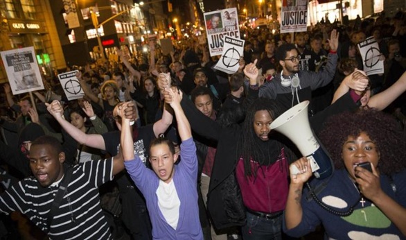 نظم متظاهرون تجمعات ضخمة أطلقوا خلالها الصافرات أمام مراكز للشرطة في شتى أنحاء مدينة نيويورك في بداية موجة ثانية من الاحتجاجات المزمعة ضد قتل رجل شرطة أبيض رجلا أسود أعزل.