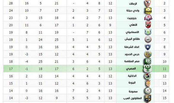 واصل فريق الكرة الاول بنادى انبى تصدره لترتيب جدول الدورى الممتاز عقب انتهاء منافسات الإسبوع الـ 13 بالدورى الممتاز برصيد 29 نقطة ويأتى فريق الزمالك فى المركز الثانى برصيد 28 نقطة وفى المرتبة الثالثة وادى دجلة برصيد 24 نقطة.