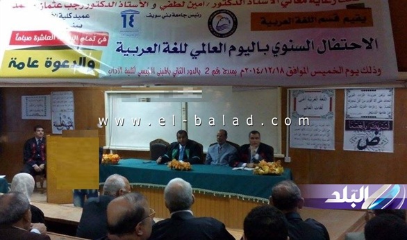 نظم قسم اللغة العربية بكلية الآداب بجامعة بني سويف احتفالا باليوم العالمي للغة العربية بحضور الدكتور رجب عثمان-عميد الكلية والدكتور جودة مبروك - وكيل الكلية لشئون خدمة المجتمع وتنمية البيئة والدكتور رمضان عامر- رئيس قسم اللغة العربية بمدرج (2) بالكلية وسط حضور لافت من أعضاء هيئة التدريس والطلبة والطالبات.