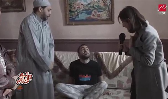 وظهر أحد الأشخاص مدعيا بأنه ملبوس من عفريت، وانفعل على المذيعة المؤدية لدور ريهام سعيد، قائلا "هموتك بالسكينة في ضهرك عشان انتي بتخافي"، فردت عليه: "لا مش بخاف، والله العظيم مش بخاف، لأني أوفر أصلا".