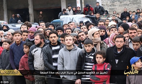 وقامت الجماعة بتنفيذ الحكم بحى الباب، بمدينة حلب السورية، بعد صلاة الجمعة، حيث تجمهر العديد من المدنيين لمشاهدة الوقعة، حيث نشر التنظيم لقطات ليد السارق بعد تنظيف جراحه، وقامت بعدها بالتشهير بأحد الجواسيس لاتهامه بتثبيت أدوات تجسس بالمبانى التابعة للتنظيم.