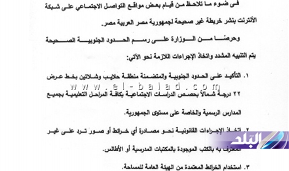 أصدر الدكتور محمود أبو النصر، وزير التربية والتعليم، كتابا دوريا أكد خلاله أنه حرصا من الوزارة على رسم الحدود الجنوبية الصحيحة في المناهج التعليمية، فلابد من التأكيد خلال حصص الدراسات الاجتماعية بجميع المراحل التعليمية بجميع المدارس الرسمية والخاصة على مستوى الجمهورية، على أن الحدود الجنوبية متضمنة منطقة حلايب وشلاتين بخط عرض 22 درجة شمالا.