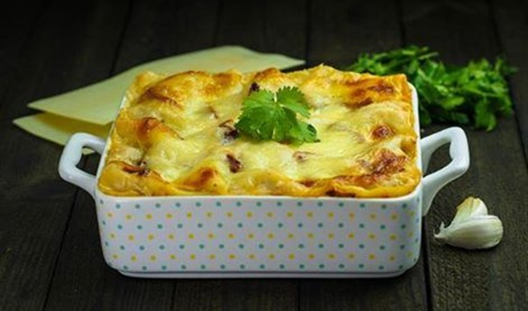 6-في صينية الفرن توضع المكرونة ويضاف إلى السطح الجبنة الموزاريلا وتسوى في درجة حرارة متوسطة لمدة 20 دقيقة أو حتى احمرار السطح.