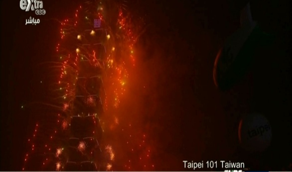 ففى تايوان غظت الألعاب النارية احد الأبراج الشهيرة هناك ورسمت أشكالا عديدة مما أبهر الحاضرين والمشاركين فى الاحتفالات بتايوان .