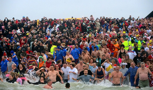 وطبقا لصحيفة " الديلى ميل " البريطانية التى نشرت صور للبريطانيين أثناء الاحتفال بالعام الجديد بالغطس فى مياه البحار والأنهار بملابسهم، فأن البريطانيين قد تحدوا الطقس ونزلوا إلى الماء رغم درجة الحرارة المنخفضة.