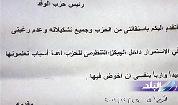 وأضاف عضو الوفد السابق، قائلا :"اليوم بعد أن أصبح الحزب لا يسع أبنائه وأشياء أخرى كثيره لا أحب الخوض فيها، أكتفى بأننى تقدمت باستقالة نهائيه من الحزب وجميع تشكيلاته.